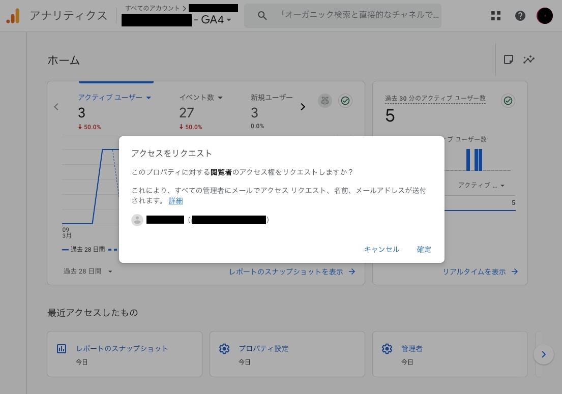 | アクセスをリクエスト このプロパティに対する閲覧者のアクセス権をリクエストしますか? これにより、すべての管理者にメールでアクセス リクエスト、名前、メールアドレスが送付されます。 |