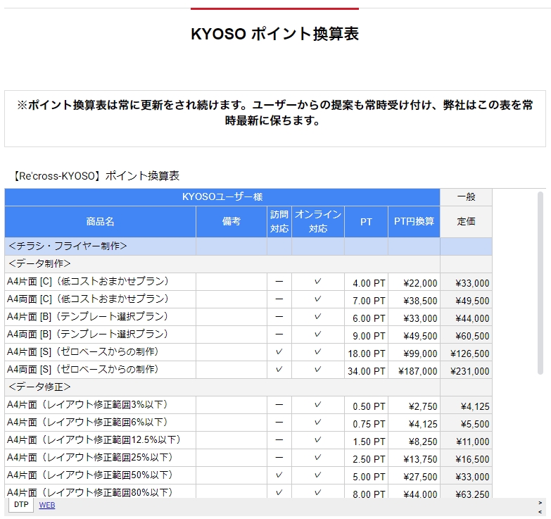 KYOSOの定期契約を頂いているお客様は、ポイント換算表に応じ様々なサービスへアクセスすることが可能です。